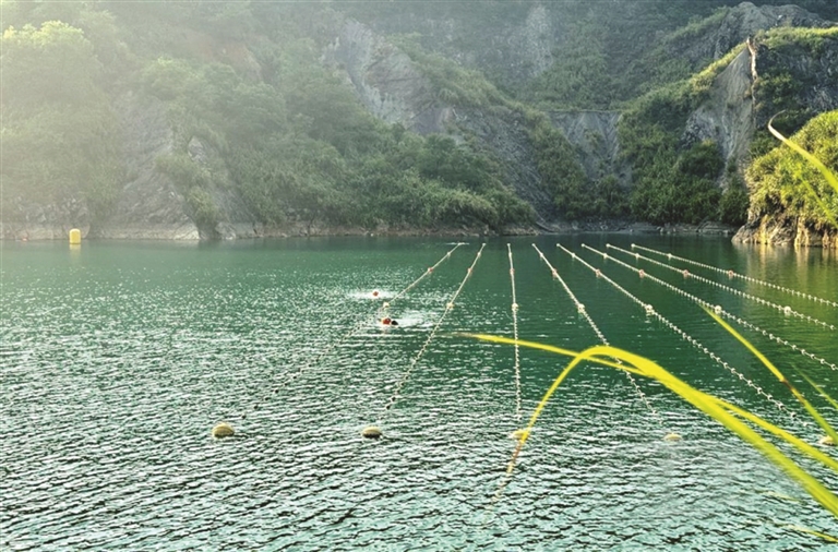 如若追求更多野趣,则可去往位于江山的石坑湖公开水域游泳场所(下称“石坑湖”)。此处原本是上世纪开采矿石留下的矿坑,后因雨水积蓄,形成了水域面积约4.8万平方米、最深处可达30米的天然生态湖泊。夕阳下,蓝色的湖水在群山之间波光粼粼地跳跃着,系着安全浮囊的两道身影一前一后跃入这一汪蓝色之中,留下一串湿漉漉的脚印。