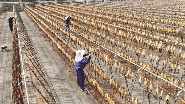 日前,在普陀区展茅鱿鱼市场一水产食品加工企业晒场内,工人们正在高温下忙着晾晒一批批鱿鱼鲞。时下是晒鱼鲞的最好季节,正值该企业生产旺季,连日来,工人们加班加点赶订单,日晒鱿鱼鲞在20吨至30吨之间。