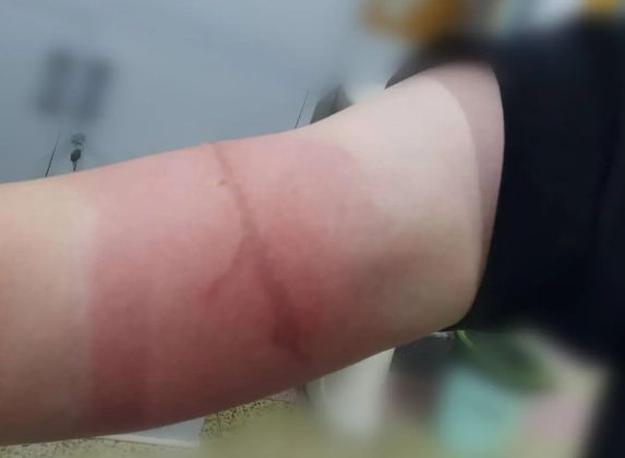 没一会工夫,他的手臂上就出现了一条长约16厘米的“线”,除此之外身上还出现大面积红肿。