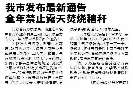 我市发出最新通告,全年禁止露天焚烧秸秆(《舟山晚报》8月29日报道)。舟山的好空气一直在全国名列前茅,而要始终做到一尘不染、秋毫无犯并不容易,需要方方面面一丝不苟的严格监管、依法治理。我市禁烧秸秆久矣,但事实上“野火”依然不绝,在落实全年禁烧中还得疏堵结合,尤其要坚持服务为先。