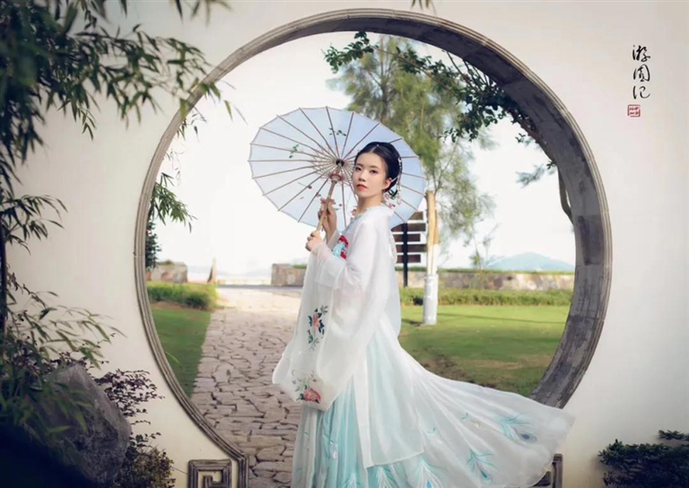 比如网红海岛东极就被许多古风爱好者纳入镜头。海和天就是最好的背景。穿一袭汉服襦裙,当海浪轻拍岸边,与古装上的轻纱共舞,每一帧都是不可多得的美景。走在东极的蓝海边,走进东极的石屋里,每个角度都留下了古风的韵味。