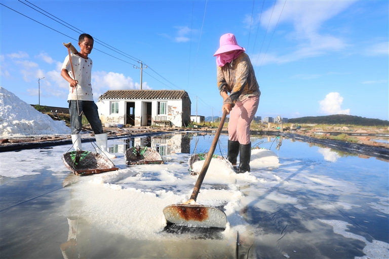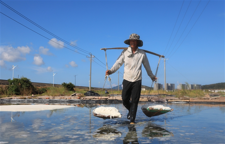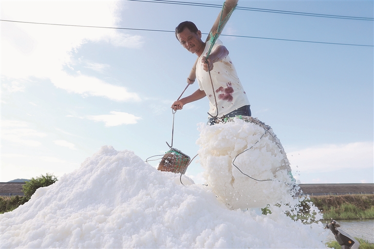 昨天,在朱家尖顺母北站盐场,晒盐工正忙着晒盐。当下正值晒盐生产旺季,盐农们抢抓晴好天气加班加点晒制海盐,日产量在2500公斤以上。图为晒盐工正在担盐,收起的盐堆积如山。