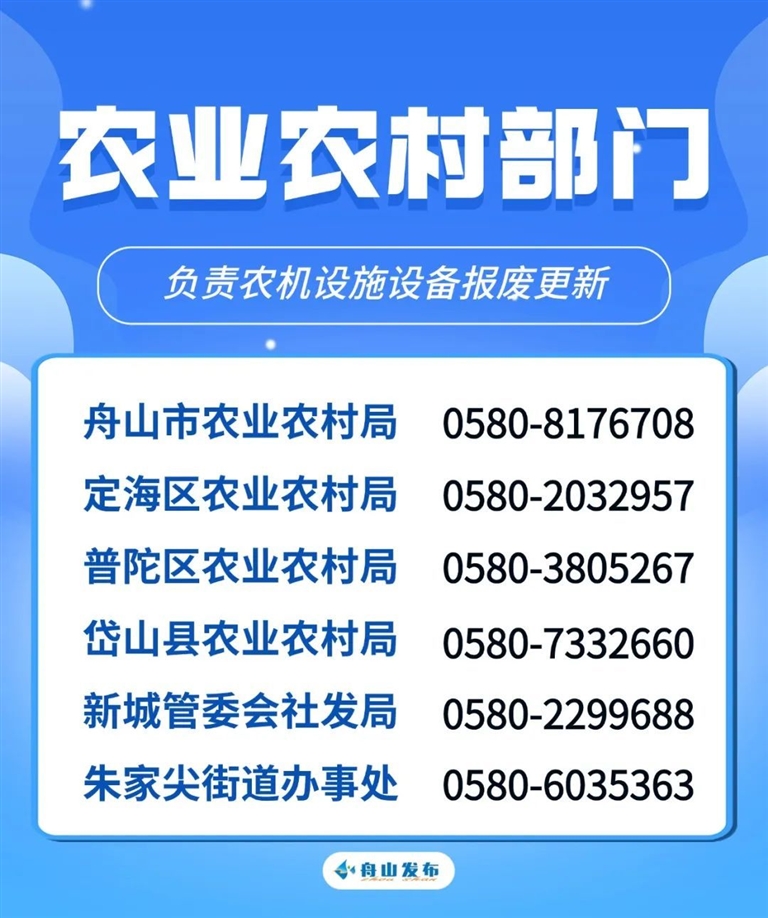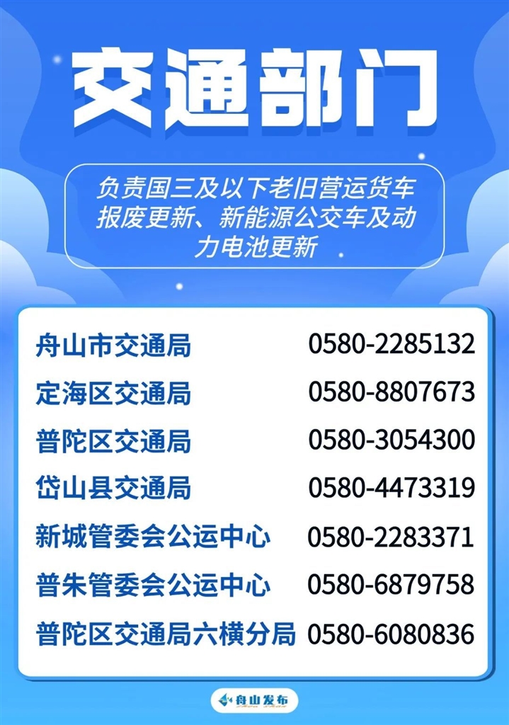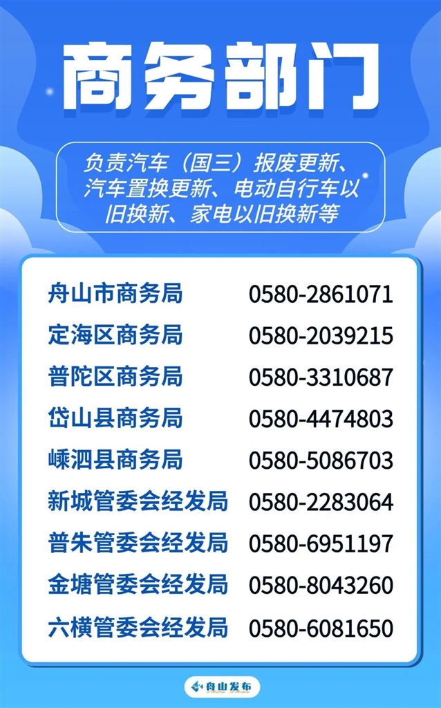 日前,舟山出台了《舟山市进一步推动消费品以旧换新行动方案》,为方便大家咨询,现将舟山市本级及各县(区)、功能区相关部门政策咨询电话公布如下。