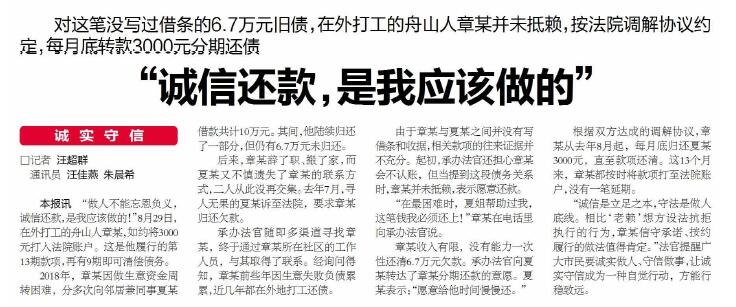 没有写过借条,缺乏往来证据,但生意失败的章某依然不忘旧账,他一边在外打工,一边分期还债,没有一笔延期(《舟山日报》9月5日报道)。生意有起有落,章某落魄中不忘诚信,可谓虽败犹荣,可期咸鱼翻身。