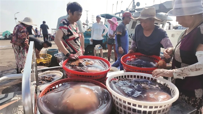 一艘艘渔船相继抵达,带来满舱海蜇。市民在码头开始挑拣、称重,交易采购,一片熙熙攘攘的景象。