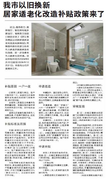 我市以旧换新居家适老化改造补贴政策来了,近期“浙里办”将开放申请,活动补贴时间为8月22日起至12月31日(《舟山晚报》9月10日报道)。面向居住在舟山的60周岁以上老年人,每户最高补贴2万元,这样的惠老政策真是机不可失时不再来。