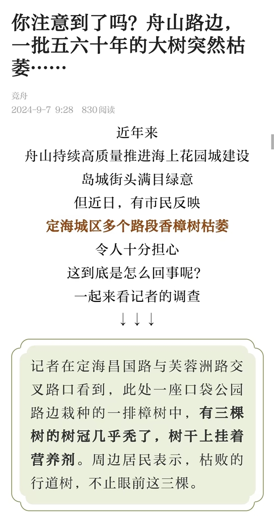 近日,有市民反映,定海城区出现了多处香樟树枯萎的现象,令人十分担心。据定海区市政园林管理中心统计,目前定海城区有20余棵树出现了枯死现象,分布在昌国路、东河路、文化路等地,均已采取了应急措施(9月7日《舟山日报》报道)。