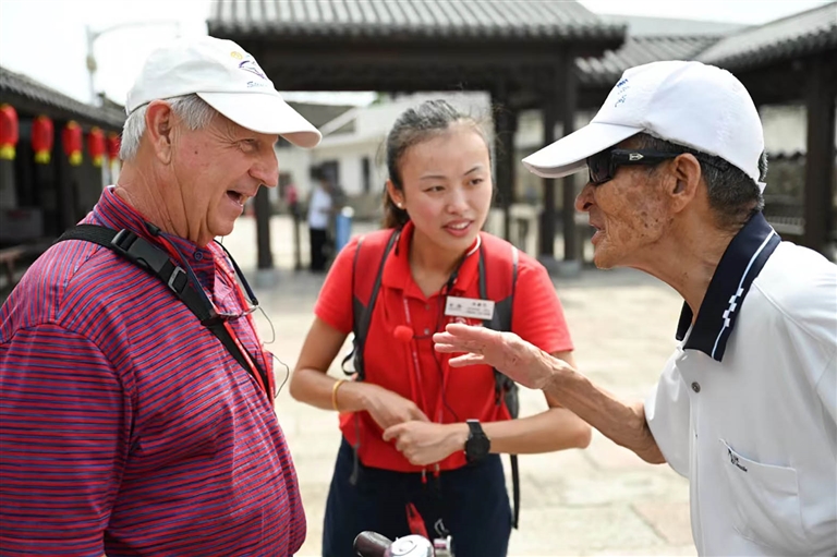 美国游客(左)与东沙居民热情交流
