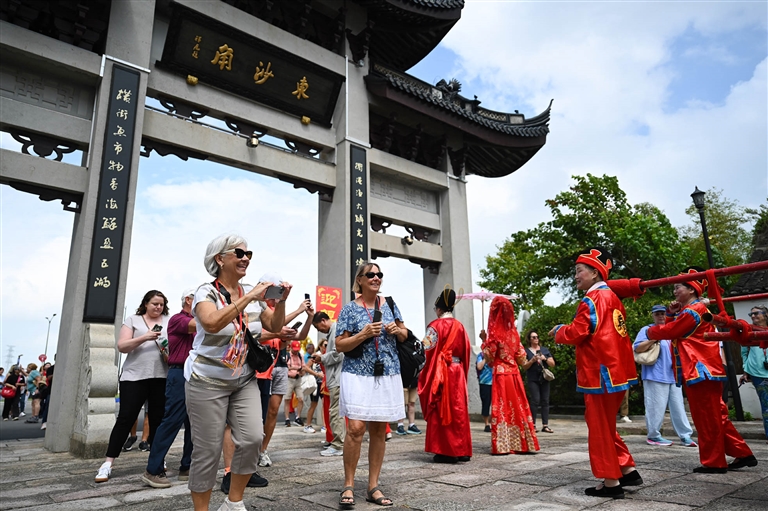外籍游客游东沙古镇 记者 姚凯乐 郭超 摄