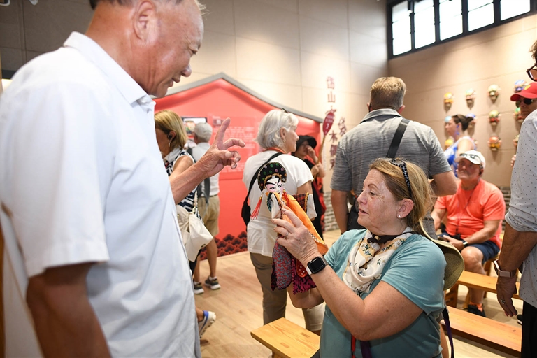 非遗传承人向游客介绍布袋木偶戏