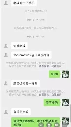 上个月11日,章先生加了一名微信网友,对方声称单位搞活动,要买3部苹果手机。在议定24750元的总价后,对方当天就把钱汇到了章先生的银行账户里。章先生留意到了一丝异样,“加我微信时,微信显示对方异常(账号安全性未知),我其实当时也想过可能遇上骗子了,但出乎意料的是对方真的给我打钱了。”