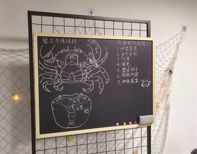 唐舟凯也按照设想赋予了工作室互动属性,一块小黑板上画着螃蟹结构分解图,客人可以在唐舟凯的带领下按步骤尝试亲手将一只螃蟹制成标本。