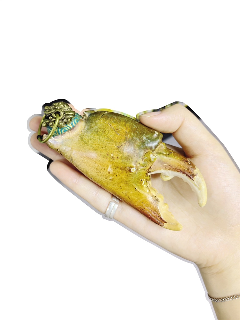 为了模拟寄居蟹在自然环境中的状态,唐舟凯用滴胶做了几个小海葵粘在寄居蟹标本的蟹钳上,像这样组合成造景标本,观赏性又大大提升了。青蟹的大蟹钳被他做成了手把件,可以当挂饰也可以拿在手里像文玩核桃一样盘玩。
