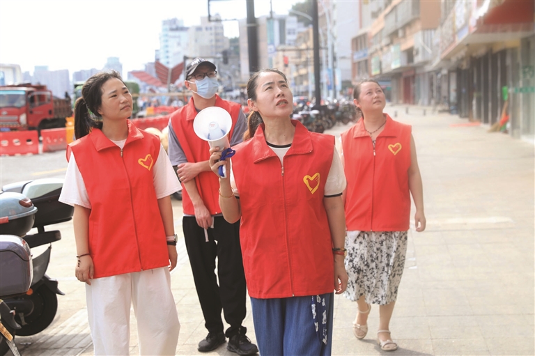 9月14日,沈家门街道荷东社区工作人员带上小喇叭在辖区开展防台宣传。此外,社区还利用LED屏、网格短信等,提醒居民抗台相关注意事项,要求沿街商家加固有安全隐患的店铺招牌。
