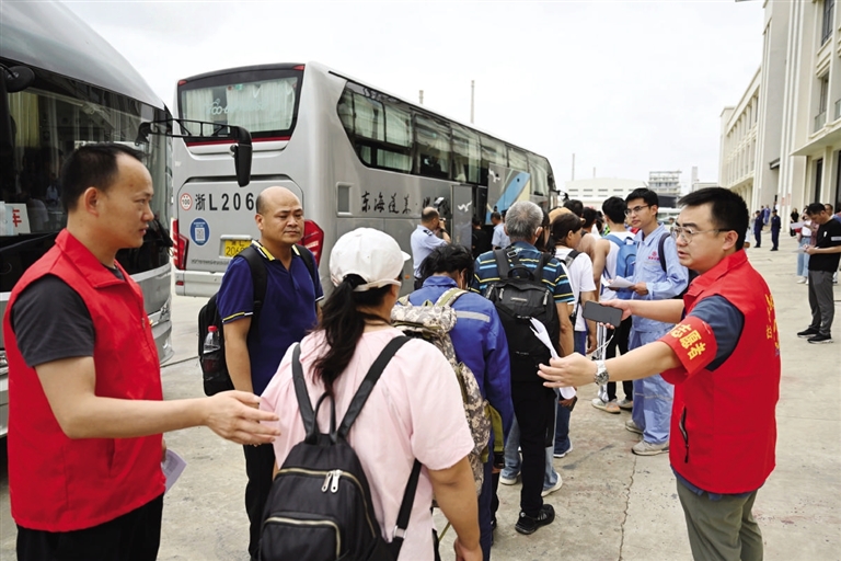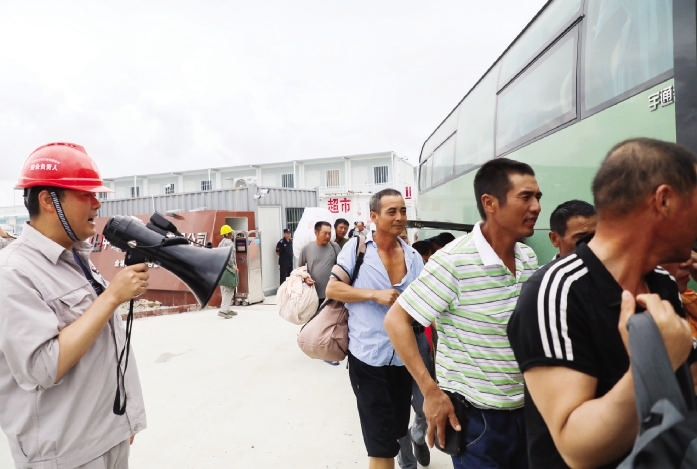 舟山绿色石化基地,志愿者引导建设者有序上车撤离 图/姚凯乐