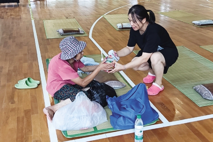 普陀区展茅街道安置点,工作人员为安置群众送上食物 图/滕忠平