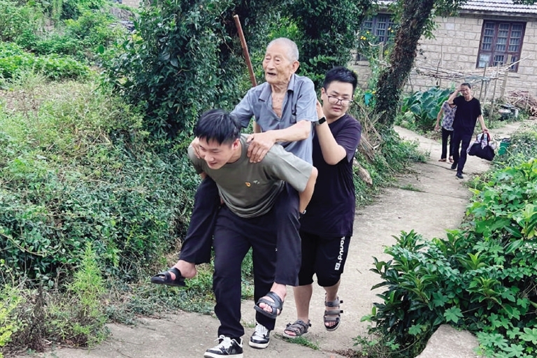 普陀区桃花镇对峙村应急小分队成员背着行动不便的老人前往临时安置点 图/方碧蓉