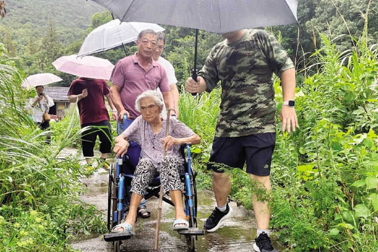 嵊泗县洋山镇城东社区工作人员将居住在危旧房中的老人转移至避灾安置中心 图/黄晶晶