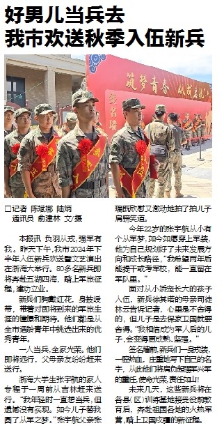 9月12日下午,我市2024年下半年入伍新兵欢送暨文艺演出在浙海大举行。80多名新兵即将奔赴五湖四海,踏上军旅征程,建功立业(9月13日《舟山晚报》报道)。