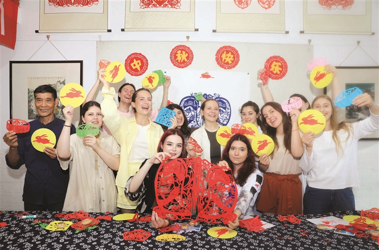 本报讯 “中秋快乐!”昨天下午,一场中秋剪纸活动在新城举行,来自浙江海洋大学的20多名留学生举着剪纸作品,互相表达中秋祝福。