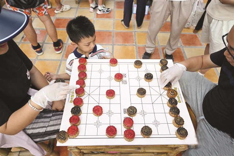 9月16日,游客在重庆涪陵美心红酒小镇体验象棋造型的月饼。中秋节临近,重庆涪陵美心红酒小镇景区推出榨菜馅、五仁馅以及象棋造型的月饼,吸引不少中外游客前来吃月饼、下“象棋”,沉浸式感受中秋节氛围。 中新网 图