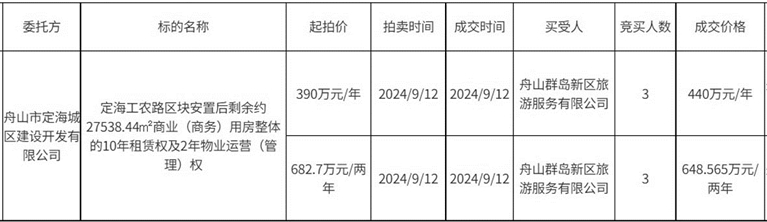 拍卖成交结果公示,工农路区块约2.8万㎡商业用房整体10年租赁权,起拍价为390万元/年,由舟山群岛新区旅游服务有限公司以440万元/年的价格竞得;物业运营(管理)权(系减价拍卖,有底价)起拍价为682.7万元/两年,最后也由舟山群岛新区旅游服务有限公司以648.565万元/两年的价格竞得。