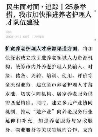 当下,我市养老护理队伍存在总量不足、专业化水平不高、流失率较高问题,扩宽养老护理人才来源渠道,深化养老护理人才培育机制,才能引来人才“活水”,满足不断提升的养老服务需求。养老护理岗位难留人,一个重要原因是待遇低、职业发展空间有限,加强养老护理人才使用管理,健全养老护理人才激励保障,将有效提升养老护理人员的职业荣誉感和社会认同度。