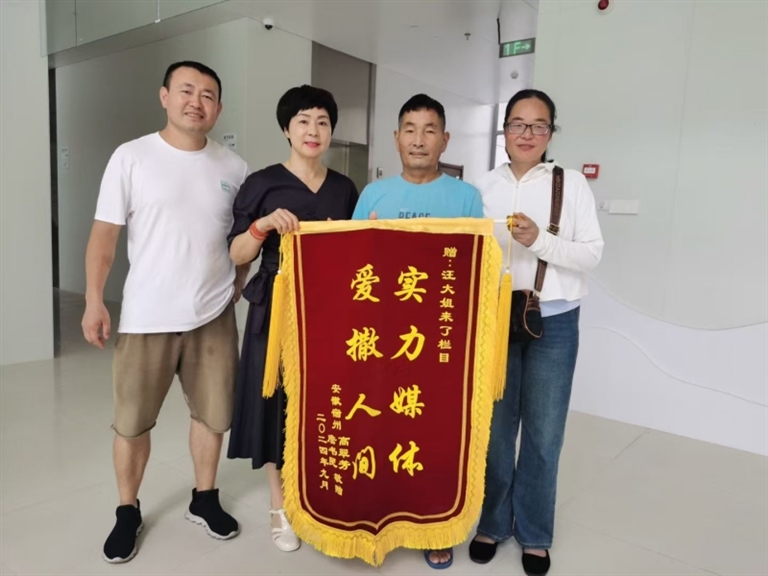 詹书民(右二)和妻子给竞舟帮帮团送锦旗