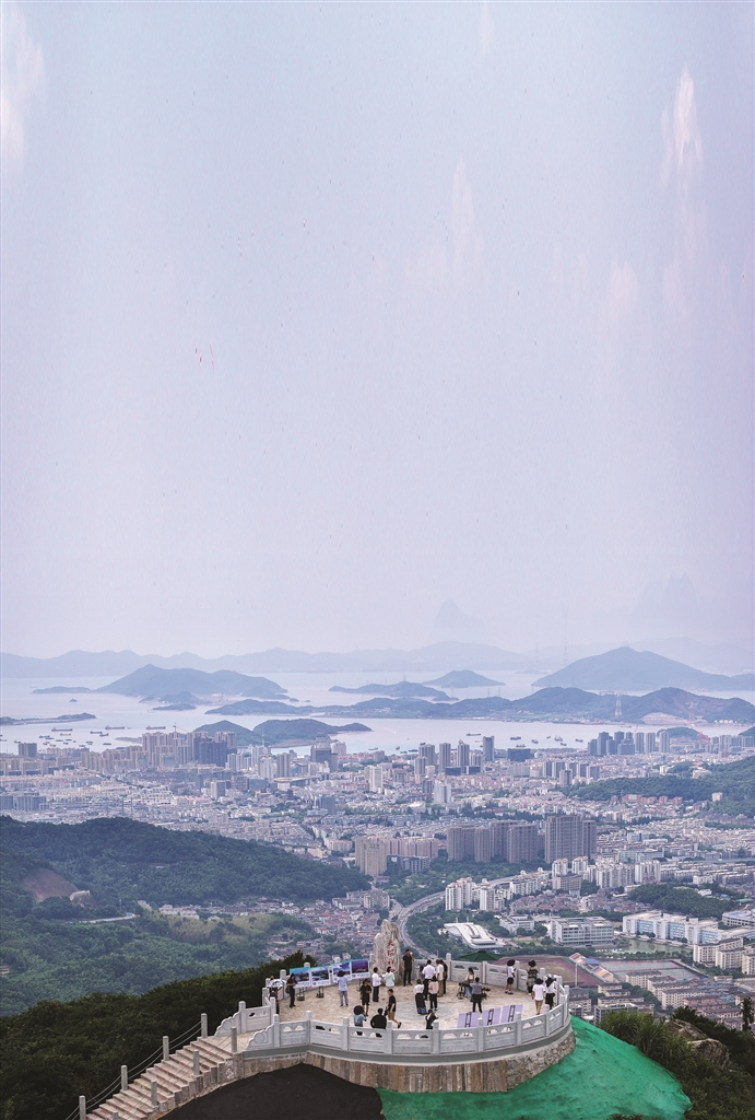 欣赏着两侧苍翠的山林,不知不觉就到了柳永笔下唯美的宵彩峰。它位于海拔451.2米的山脊之巅,宛如一弯新月静静侧卧。登顶远眺,南望诸岛如珠,文廊云顶若隐若现。“盈盈泪眼,望仙乡,隐隐断霞残照”中描绘的绝美意境,不再只是文字间的想象,而是真真切切地展现在眼前。