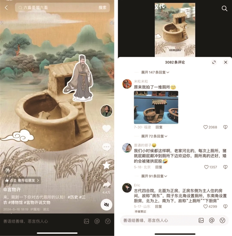 2024年2月,言物许在抖音发布了第一条视频。文物作为视频的重点讲解对象,在他的视频中,几乎每一期都会清楚地标注上其名字及目前所存放的博物馆。比如,讲古代厕所那期视频,在以不同画面示意时,就分别展示了藏于商丘博物馆、中国考古博物馆的汉朝时期的陶制猪圈。
