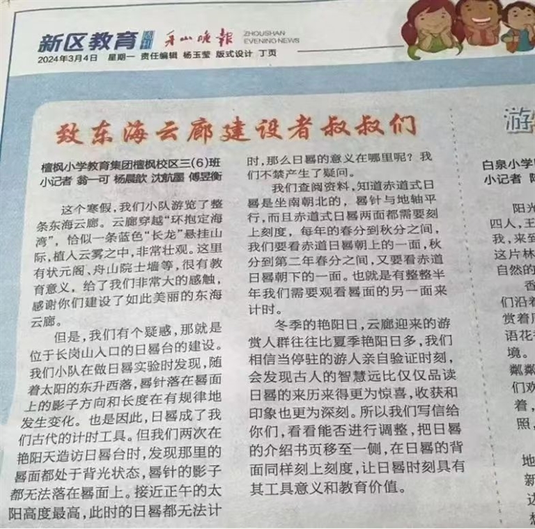 这份惊喜源于舟山晚报新区教育周刊上的一篇文章。这四名小学生将探究云廊日晷台过程中遇到的问题和因此萌发的建议,写成一篇《致东海云廊建设者叔叔们》发表在晚报上,没想到这篇文章有了回音。