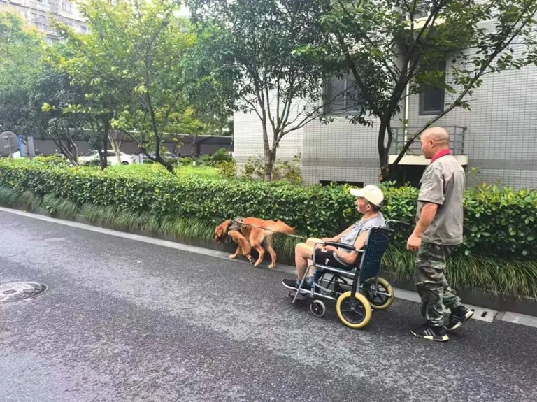 垃圾清运车上少了许成标的身影,好在这份工作对于许国兴来说,比较灵活。忙完手头工作,许国兴会推着轮椅,带着许成标到小区里走走,走在前面的是金毛犬“平安”。