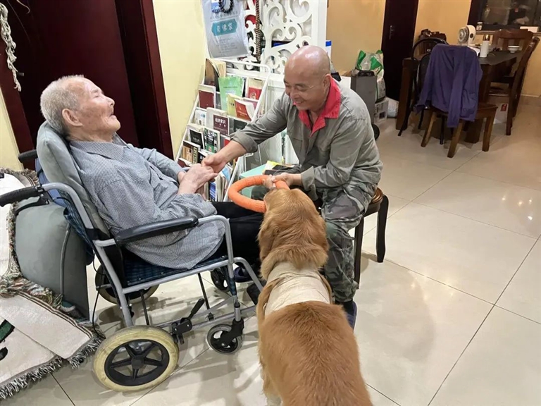 金毛“平安”也很懂事。家里有客人来,它会叼来玩具求陪玩,也会兴奋地扑向客人。唯独对许成标,它特别安静,乖乖地趴在轮椅旁。