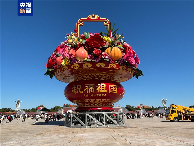 9月22日,“祝福祖国”巨型花篮吊装完成,亮相天安门广场。