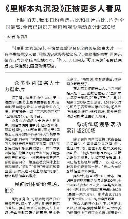 电影《里斯本丸沉没》上映以来收获如潮好评,更在舟山掀起了一股观影热潮。截至9月23日,我市已组织开展包场观影活动累计超200场,全市观影人次超1万人次。《里斯本丸沉没》上映18天,全市日均票房占比36.9%(最高一天71.6%),排片占比13.1%(最高一天18.7%),均为全国最高。同时,《里斯本丸沉没》在全国的热度也持续升温,相关话题上了近百次热搜,截至9月23日15时全国票房已突破2600万元(据《舟山晚报》9月24日报道)。