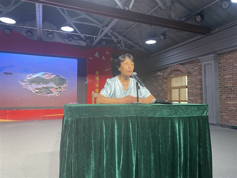 “当时我们天蒙蒙亮就起来了,与潮水抢时间,顶风冒雨干活,披星戴月回家……”9月25日下午,在蚂蚁岛的礼堂内,望着台下50多位游客,年过古稀的高月英正用流利的普通话,激昂地讲述20世纪70年代前后蚂蚁岛妇女参与三八海塘建设的往事。