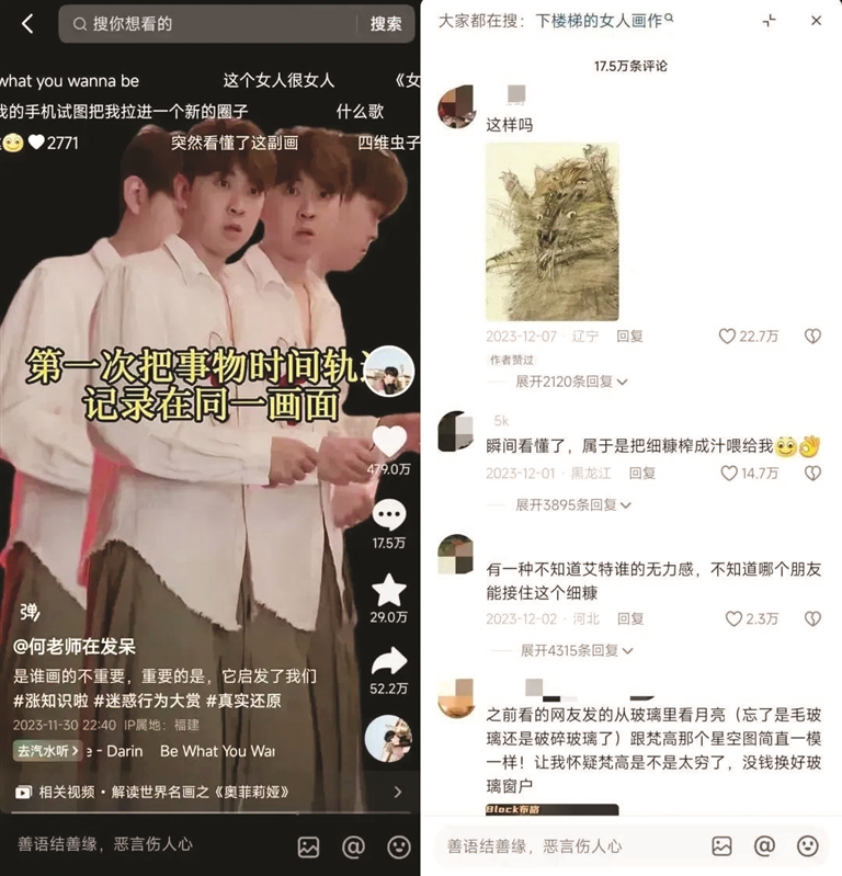 粉丝能感受到这种关怀和启发,他们会在很多个生活的瞬间,想起“@何老师在发呆”讲过的画,突然与百年前的艺术感到心灵共振,接着把它们拍下来发到抖音评论区:“当我第一次拍到星轨,我才知道梵高画的是什么”“你让我想到了我在大理拍的这张照片”“在烟台旅游的时候拍的,当时就突然理解了莫奈”……“@何老师在发呆”的艺术视频,像种子或者清水一样,让新的艺术观念在大家心中生了根,重新点醒了生活中的某些部分。