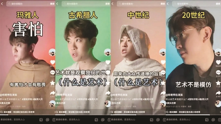 每次视频发出前,何老师都会让妻子看一看,提问题。如果她提出有哪些看不懂或没感觉的地方,他都会再去打磨一下。妻子非艺术专业出身,在视角上更接近大众。何老师在尽量降低理解门槛,给玄乎的艺术祛魅。他从来不会一上来就讲一堆大框架。因为在他看来,无需去标榜自己有多厉害,作为一个艺术解码者、传播者,更应该设身处地地去观察大家的生活、去了解他们在好奇什么,然后去看看古人有没有启发过我们。如果有,那他就去演出这个过程,“去用和古人一样的方法,把古人的手法推导出来,在艺术和生活中建立一个链接”。