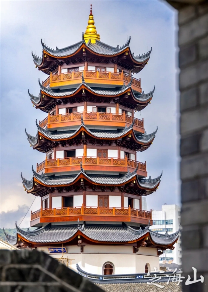 新建的奎光阁高38.24米,是一座五层八面的楼阁式塔状建筑,飞檐翘角,檐牙高啄,层层都带有回廊,典雅凝重,富有古朴之美。奎光阁是定海古城的文化象征,也是定海乃至整个舟山文脉所在。