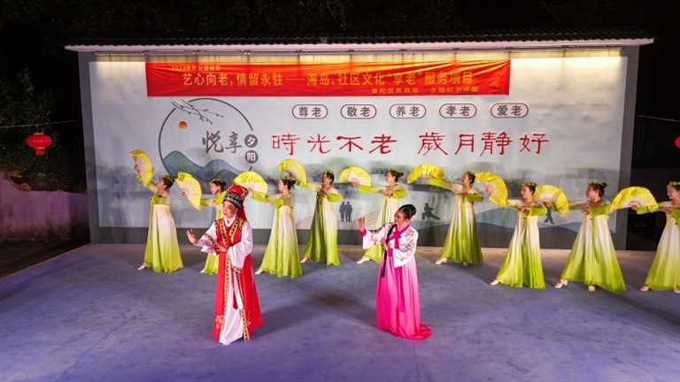 10月8日晚上,由普陀区民政局组织的夕阳红艺术团乘船过海来到六横镇敬老院,为这里的百余位孤寡老人、工作人员,以及当地的老百姓送上“艺心向老,情留永驻——海岛、社区文化‘享老’服务慰问演出”。舞蹈、越剧等精彩节目轮番上阵,博得了阵阵掌声。 通讯员 刘生国 摄