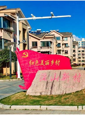 汽车进了小区,下车向前,一眼看到前面路中一道石砌,“渔山新村”四个洋红色的字刻录在淡绛色淡石块上;石牌的后面竖着鲜红的党旗石雕,党旗上还有六个黄色大字“红色美丽乡村”。这村牌宣昭着一种自信、一种庄严、一种豪迈。这是鱼山人的本色!