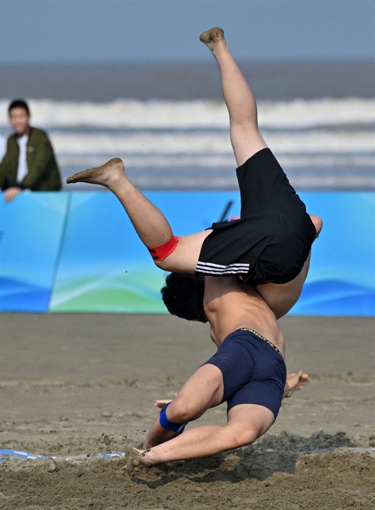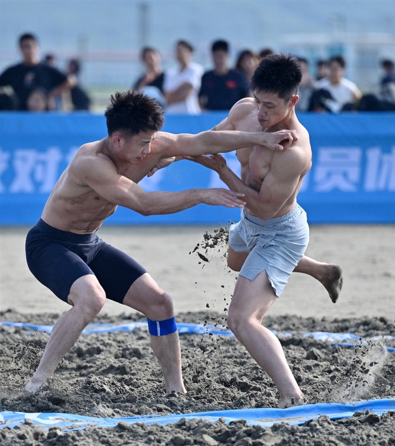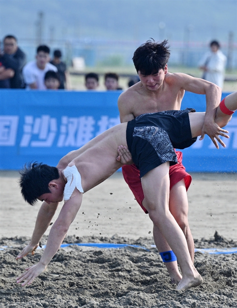 昨天上午,2024年全国沙滩摔跤对抗赛(第二站)在鹿栏晴沙景区“高燃”开赛。此次比赛为期两天,来自全国各地的20支代表队101名参赛选手参赛。记者 沈磊 摄
