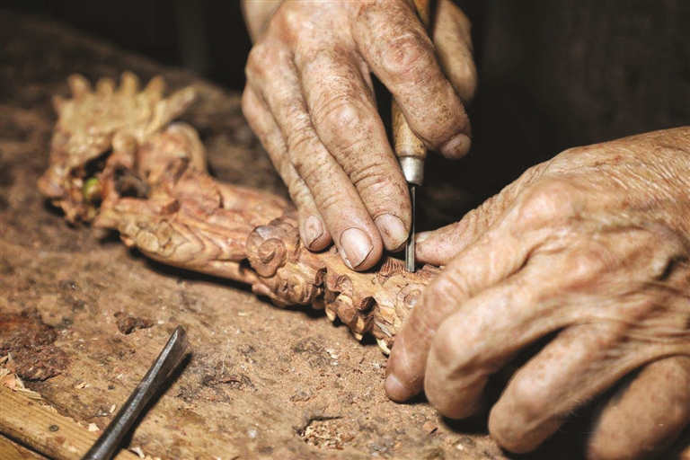 何达源戴着一副老花镜,穿着一件深灰色的围裙。吊灯下,他右手握着雕刻刀,顺着木头的纹理轻轻地推动,一刀,两刀,木屑哗哗掉落。