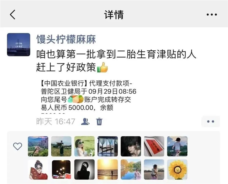 近日,普陀的梁诗雯收到一笔来自普陀区卫健局的5000元育儿补贴,她开心地截图发朋友圈,为普陀这项政策点赞。今年3月生下二胎宝宝的梁诗雯正好在补贴范围内,于是马上向户籍所在地的沈家门街道申请。9月29日,今年首批育儿补贴发放,直接打入了梁诗雯的市民卡中。梁诗雯介绍,挺开心的,这项补贴对于原有二孩、三孩计划的家庭来说,既是一份美好的祝福,也是一种看得见的帮助。