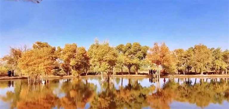 走进甘肃敦煌市黄渠镇的胡杨林,仿佛踏入了一个金色的童话世界。金色的胡杨与湖面的倒影相映成趣,一片片金黄的叶子在阳光的照射下熠熠生辉。游客们在这片光影交错中漫步,或拍照打卡,尽情欣赏这份难得的宁静与美丽。每到10月,这里的胡杨树叶会由浓绿变为浅黄色,然后逐渐变成橘黄、金黄色,是胡杨林的最佳观赏期。 据央视网