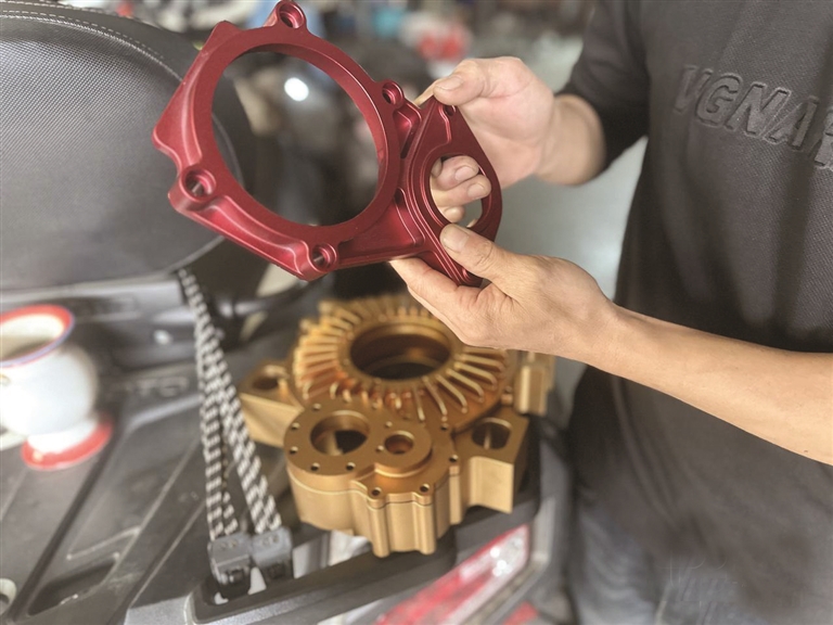 铁架子上是各类零件,“铝材店买材料,机床制作成型,氧化后表面变硬不易有划痕。”
