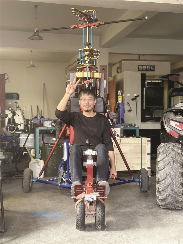 “前几天在重庆起飞的这台超轻型双旋翼共轴直升机,上面是旋翼总成,一个正转、一个反转,互相抵消旋转的扭矩,起飞的时候不会原地打转。座位前是周期变距,脚蹬控制甲叶的角度差……”聊起作品,朱海燕滔滔不绝。
