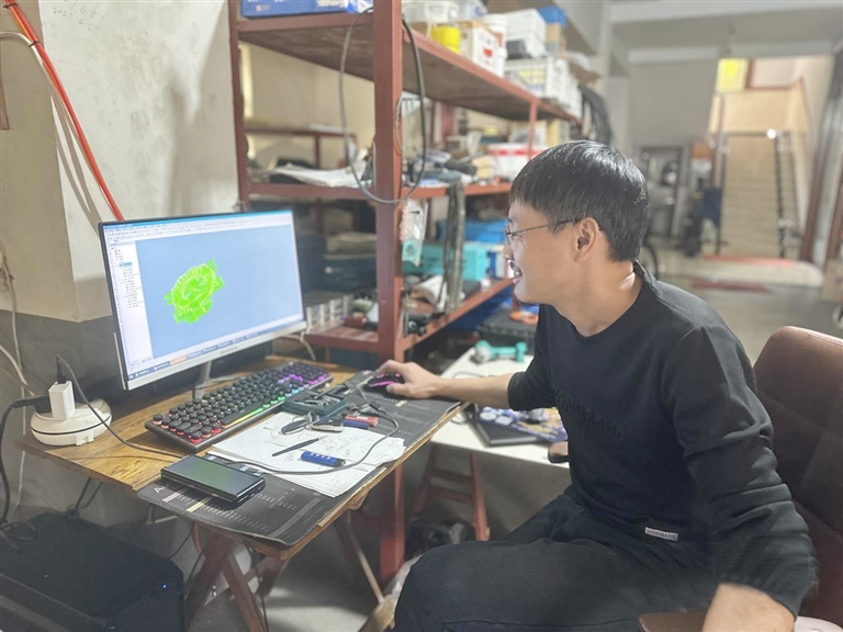 在零件车床的环绕中,一台电脑摆在工作室的中间,它是朱海燕制作飞机的“大脑”。