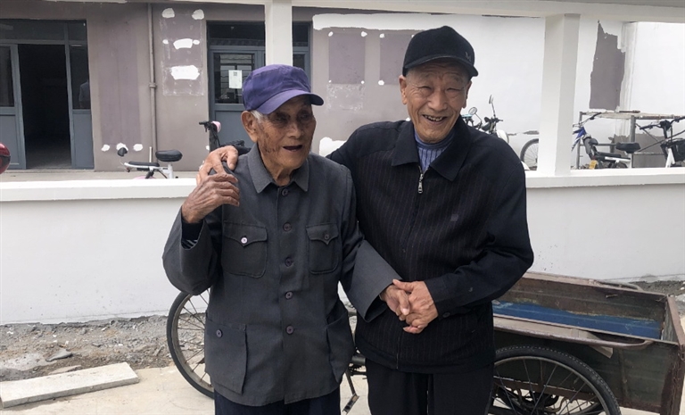 在舟山岑港街道南岙村村委会工作人员的帮助下,一别60余年的两位老战友再度相逢。