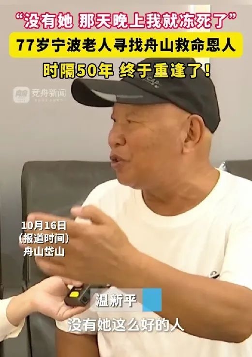 50多年前,宁波的温新平从事海上运输。一天,他在人生地不熟的岱山衢山遇到大风大雨,饥寒交加、寸步难行时,被好心的岱山衢山裁缝姑娘开门收留……此后,他4次来岱山寻恩人,10月16日,终于圆梦了!